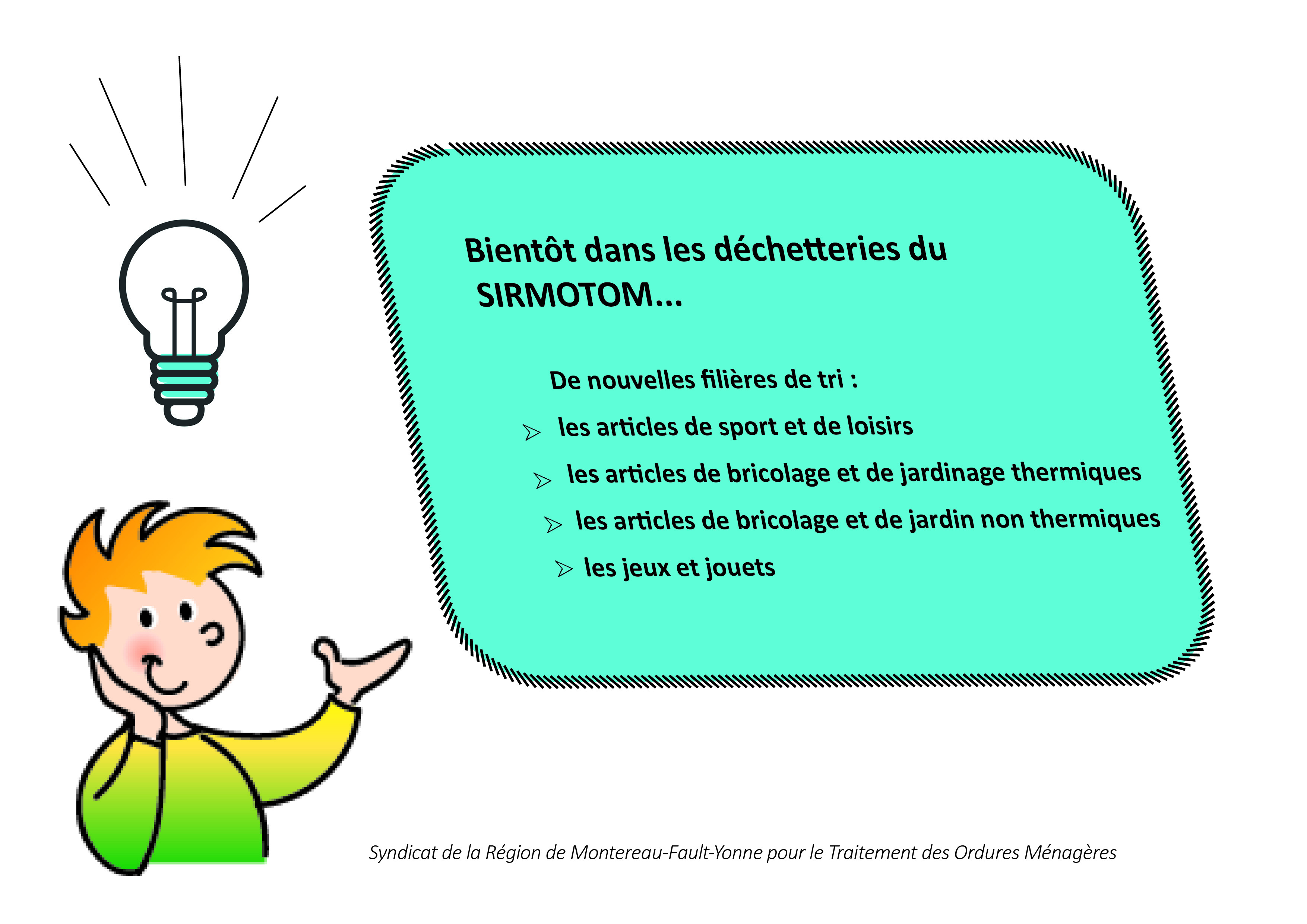 Il y aura bientôt de nouvelles bennes pour trier ces articles dans les déchèteries du territoire du SIRMOTOM. L’objectif de ces nouvelles filières REP (Responsabilité Élargie des Producteurs) est de répondre à la réglementation de la loi AGEC, la loi « anti-gaspillage ». Le SIRMOTOM vous tiendra informés de la mise en place de ce nouveau tri en déchetterie.